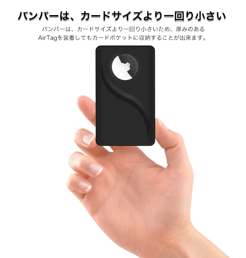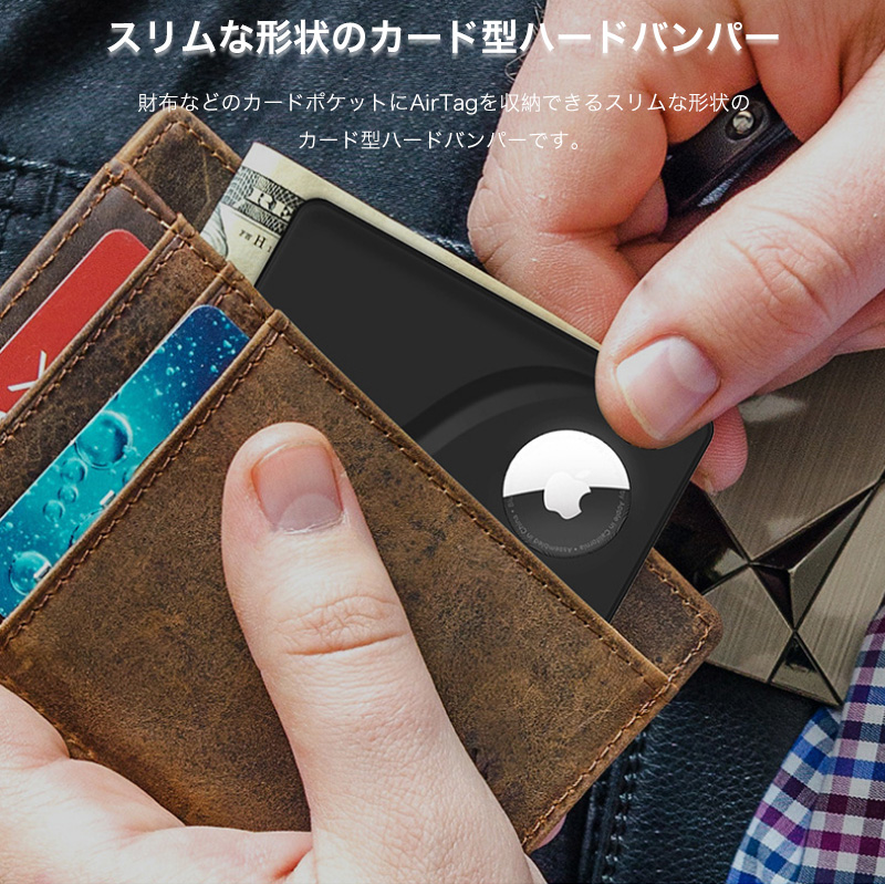 財布などのカードポケットにAirTagを収納できるスリムな形状のカード型ハードバンパーです。