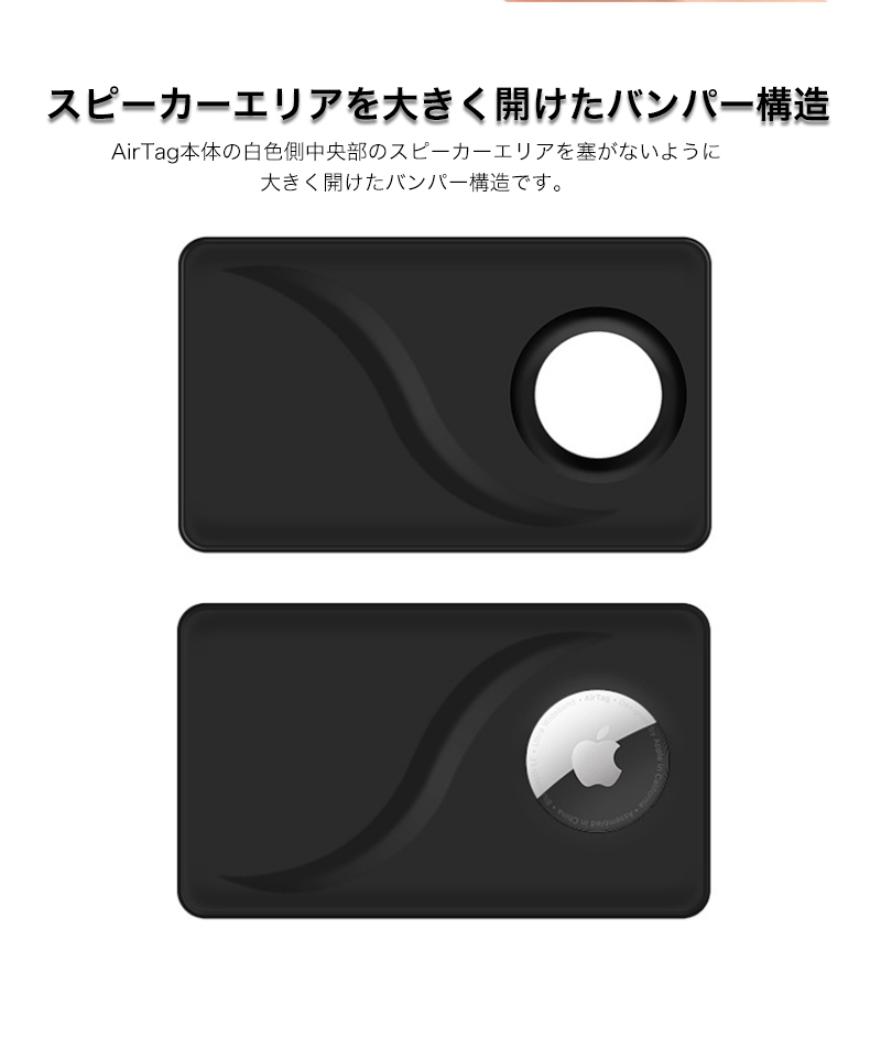 AirTag本体の白色側中央部のスピーカーエリアを塞がないように大きく開けたバンパー構造です。