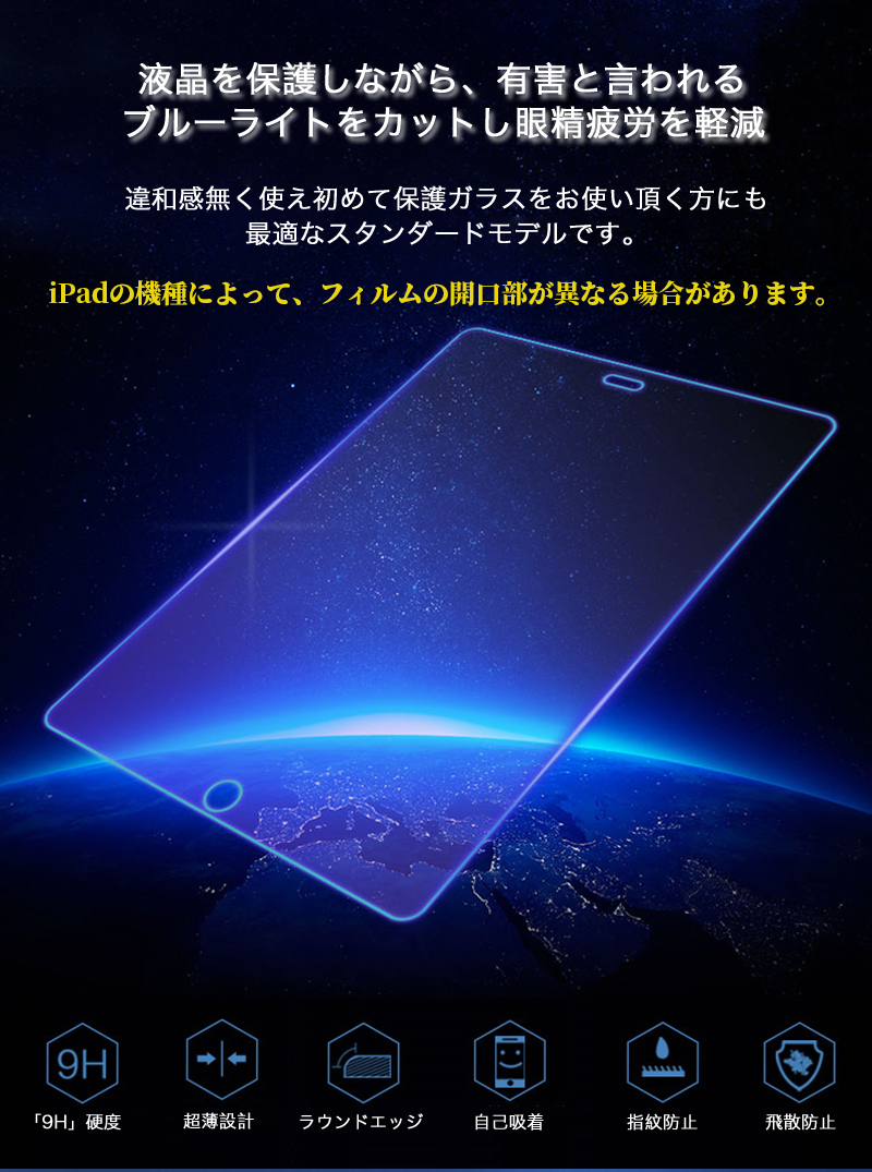 アイパッド ガラスフィルム 青色光カット 耐衝撃 9H 強化ガラス 衝撃吸収 飛散防止 指紋防止 ラウンドエッジ