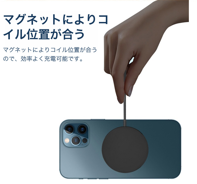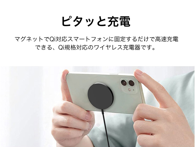 マグネットでQi対応スマートフォンに固定するだけで高速充電できる、Qi規格対応のワイヤレス充電器です。