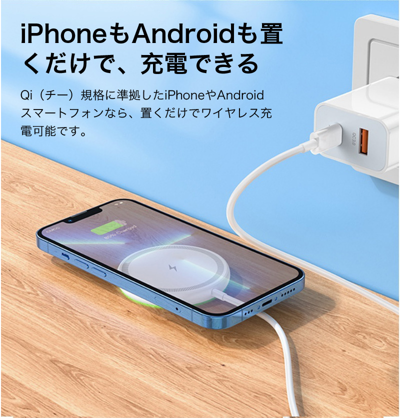 MagSafe充電器 ワイヤレス充電器 USB-A Type-C 両方対応 おくだけで充電 急速充電対応 温度検知機能付き 安全安心 アイホン 充電完了 自動停止 高温防止 異物検知 Qi規格対応 おしゃれ スタンド スリム コンパクト 薄型タイプ 爆買 クリスマスプレゼント