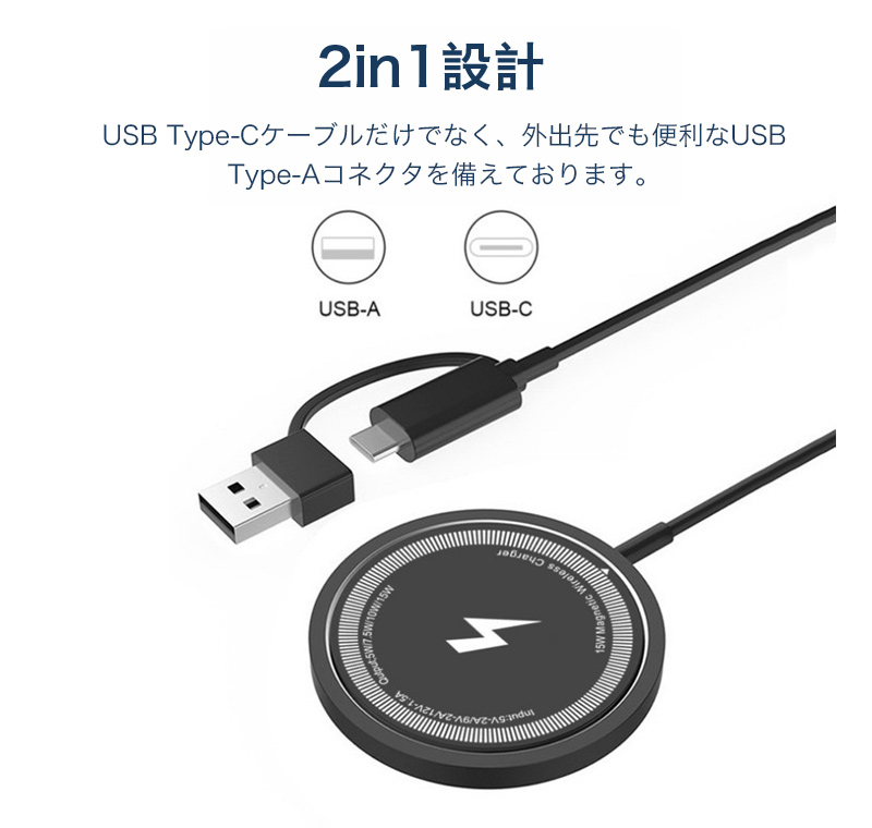 MagSafe充電器 ワイヤレス充電器 15W 急速充電 USB-A Type-C 両方対応 iPhone 17e 16 15 Pro Max ワイヤレス充電器 Qi互換 Pixel Galaxy マグセーフ充電器 薄型