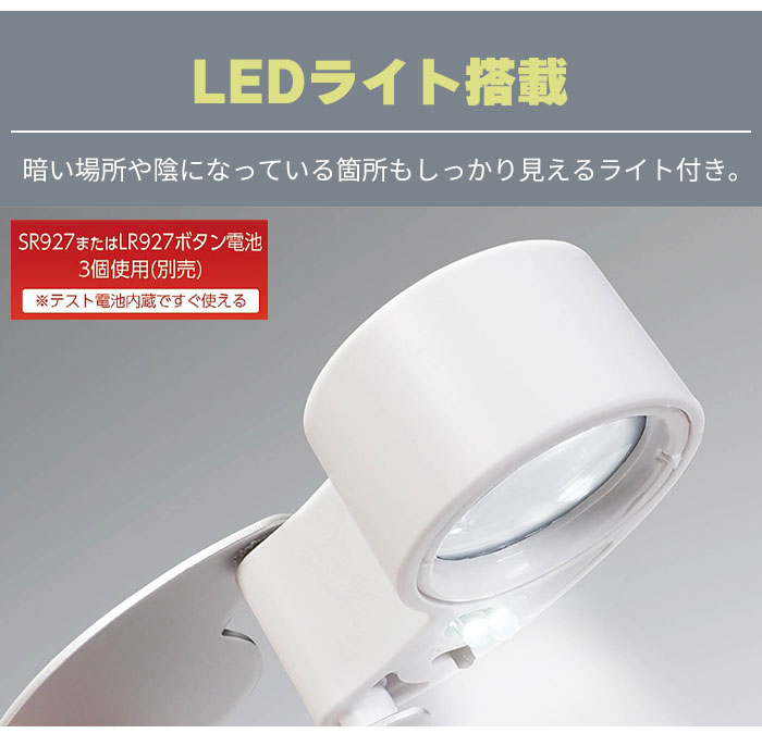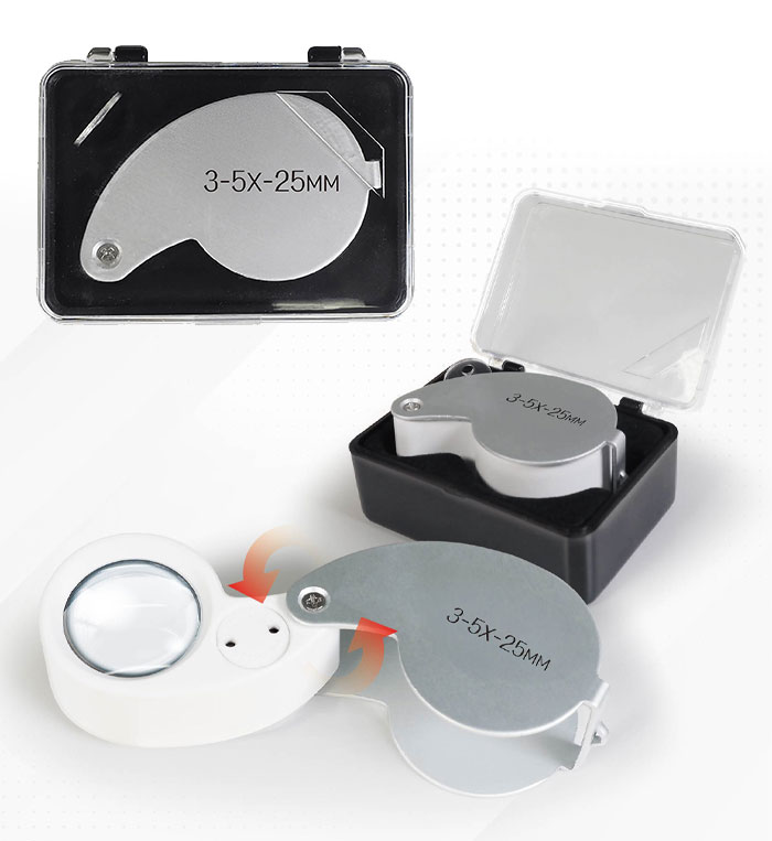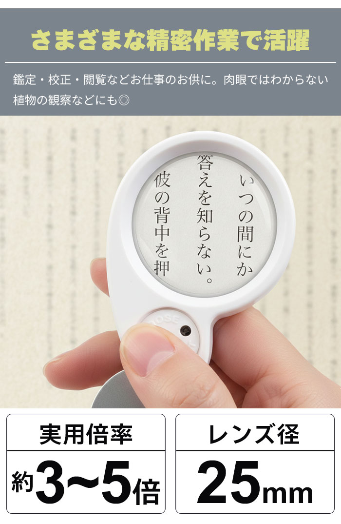 LEDライト付きで見えやすく、レンズは実倍率3〜5倍と高倍率で鑑定・校正・閲覧などお仕事のお供。