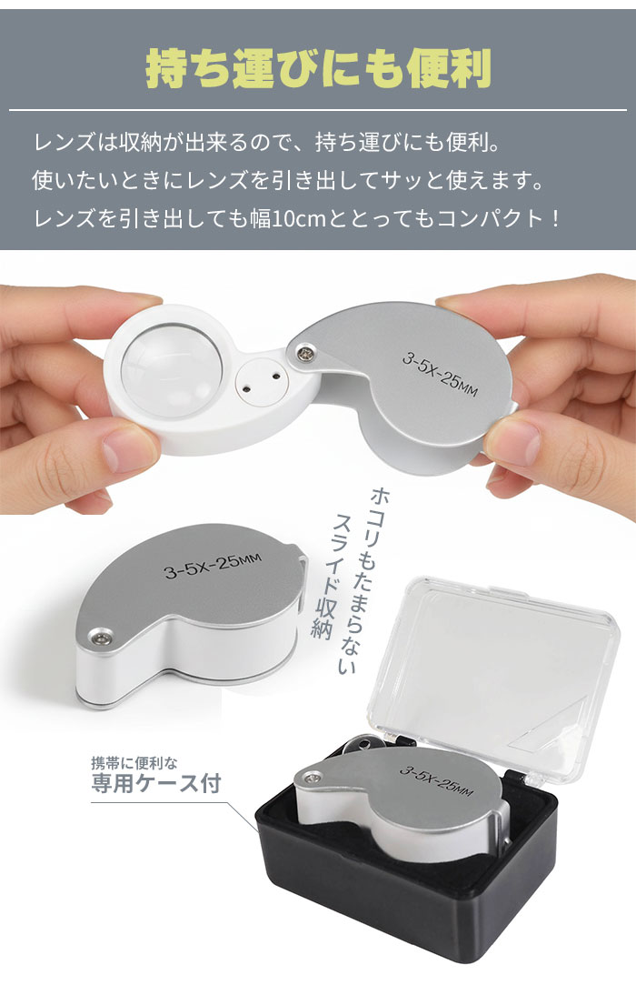 ルーペ LEDライト付き 折りたたみ式 小型ルーペ ケース付き コンパクト 3倍 5倍 拡大鏡 軽量 ポケットルーペ 携帯用 新聞 読書 観察 閲覧 LED ライト 老眼鏡