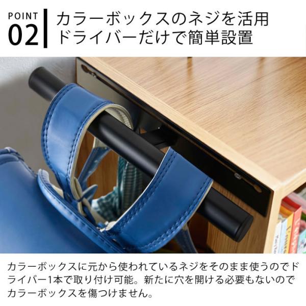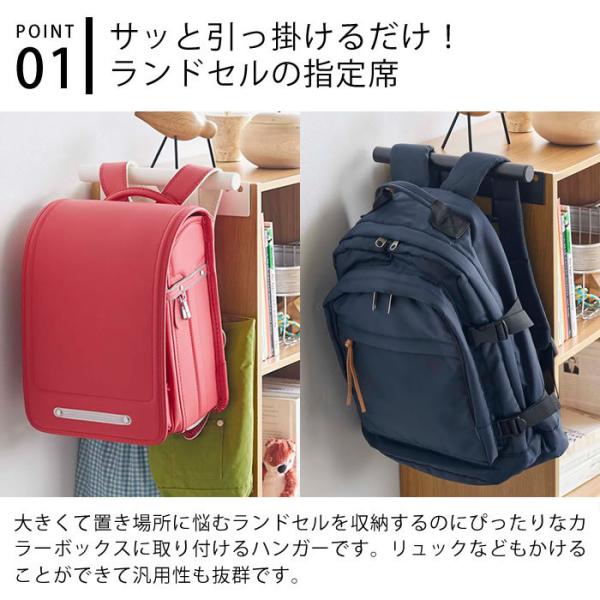 カラーボックスに簡単設置、掛けるだけで荷物がまとまるランドセル・リュック用ハンガー