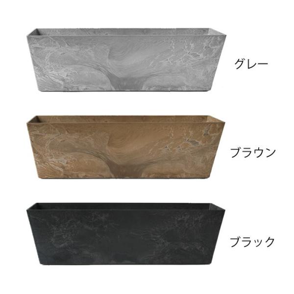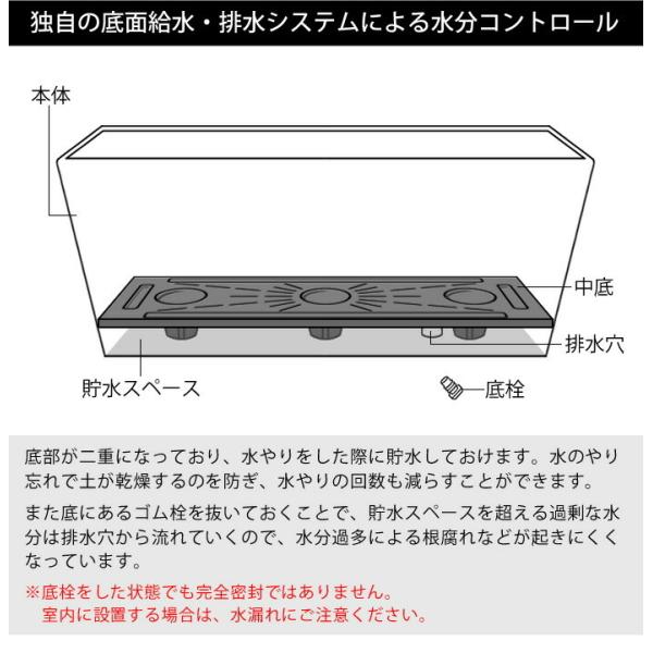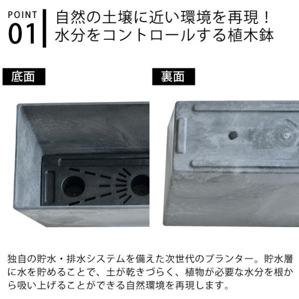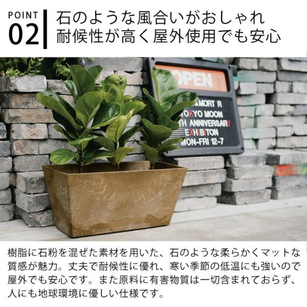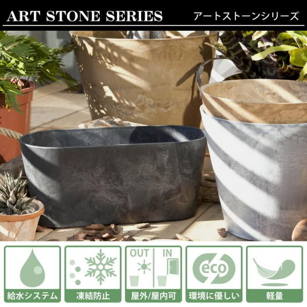 amabro ART STONE CONTAINER SQUARE Mサイズ 給水・排水システムを備えていて、水やりの際に水を貯水スペースに貯めておくことができ、植物が必要な水分を根から吸い上げることができるプランターです。 水やりの回数を減らすことができて、お花やグリーンのお手入れを補助。 底のゴム栓を外しておけば貯水スペースより溢れる分の水分を排水できるので根腐れ防止に。 樹脂とストーンパウダーによる石材や土もののようなタッチがおしゃれで、この素材は耐候性が高く、凍結もしにくいので屋外でも安心。 見た目は石のようですが樹脂製なので、素焼きや陶器のプランターより軽量なのも嬉しい仕様です。 角が丸く柔らかい印象の「ラウンド」タイプと、角ばった形状がおしゃれな「スクエア」タイプがあり、サイズもSとMの2サイズあるので、好みや用途に合わせてお選びいただけます。 商品詳細 サイズ 【外寸】 約 W550×H170×D165mm 【内寸】 底部:約 W485×D115mm 上部:約 W540×D155mm 貯水スペースを除く高さ:約 115mm 重量 約2150g 素材 ストーンパウダー、ポリプロピレン 原産国 マレーシア