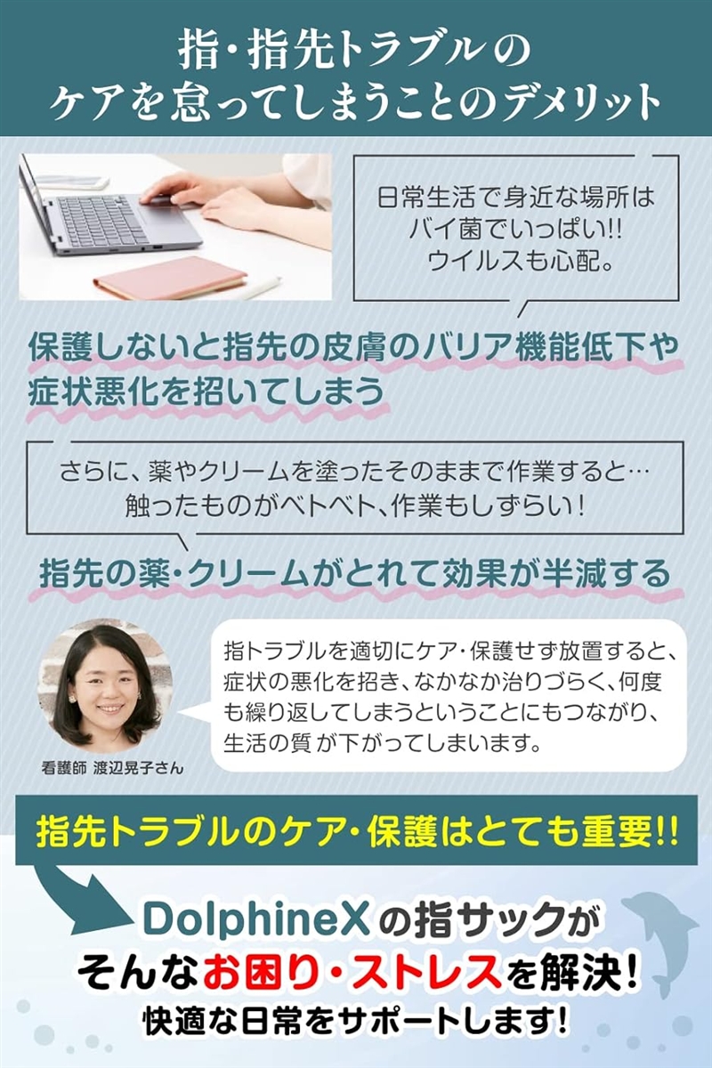 また、トラブルがある指先に塗った薬・クリームを上からしっかりカバーし、効果を持続させることができます。