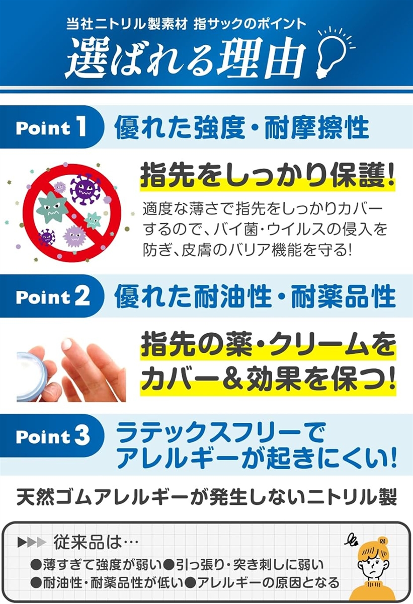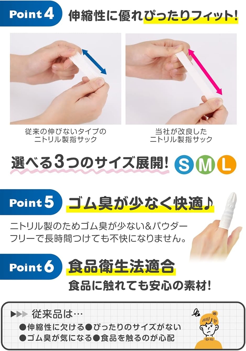 ?「指先にぴったりフィット」既存のニトリル製指サックの伸縮性を改良し、よりフィットする仕様にしました。