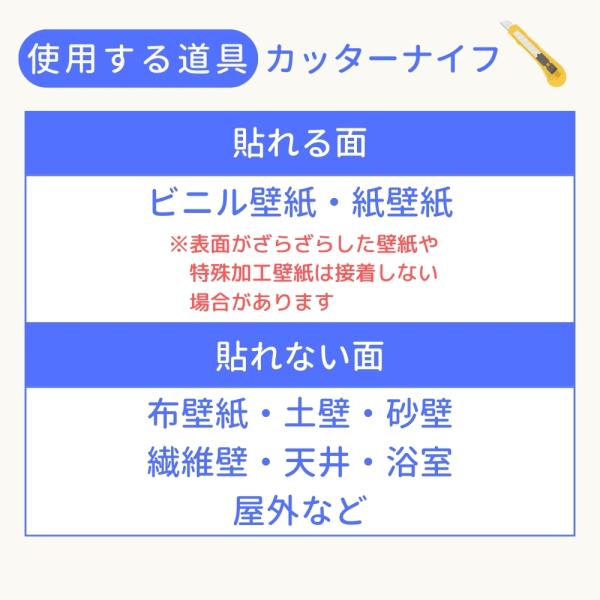 ・貼れない面:布壁紙・土壁・砂壁・繊維壁・天井・浴室・屋外など