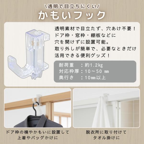 『爆買WEEK■限定クーポン発行』透明で目立ちにくい かもいフック 鴨居フック 2個 ちょうどいい高さに フックが大きくてかけやすい 鴨居 ドア枠 クリア