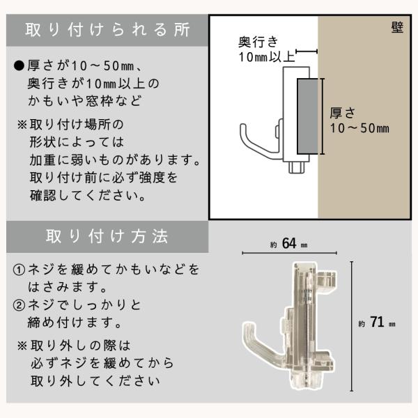 扉や鴨居に引っ掛けるだけで、洋服やバッグ、タオルなどを手軽に収納できます。2.1×7.1×6.4cmのコンパクト設計で、狭いスペースでも邪魔にならず、すっきり整理整頓。