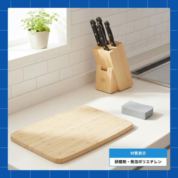 洗剤を使わず、水だけでザラつき・黒ずみ・よごれをしっかり削り落とし、まな板の清潔さを簡単にリフレッシュできます。