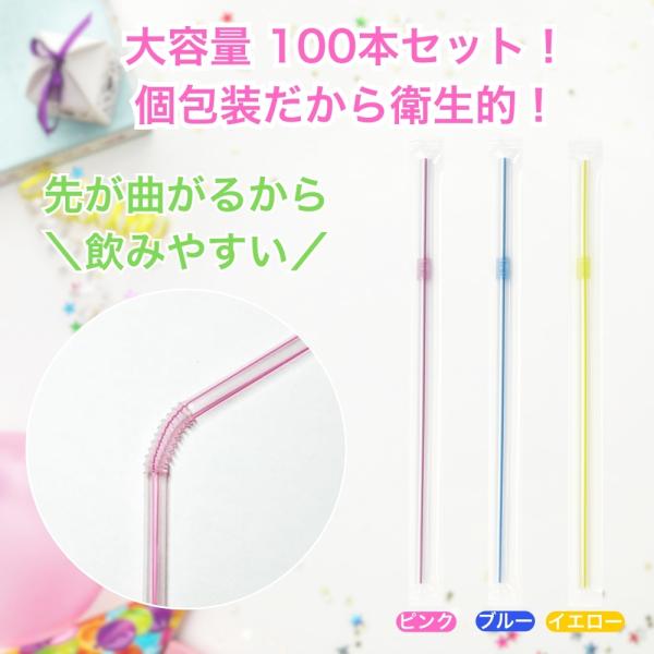 ストロー 曲がる ストライプ 100本入 5×190mm 個包装 透明袋入 食品衛生法適合 使い捨てストロー