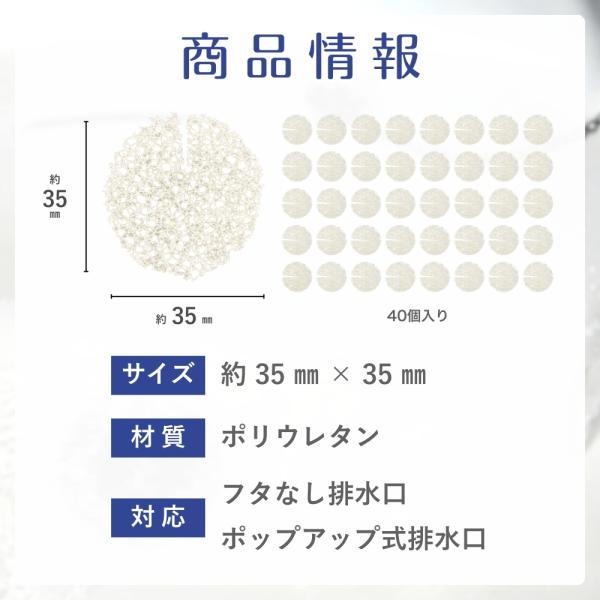 洗面台の排水口にたまる髪の毛やゴミを、手軽にキャッチできる使い捨てタイプのゴミガード40個セットです。排水口にポンと置くだけで、細かい髪の毛や汚れをしっかり受け止め、排水溝の詰まりを防ぎます。