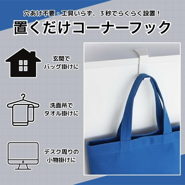 置くだけコーナーフック 2個セット 机 棚 家具 小物掛け カバン掛け かもい 鴨居 コーナー取付 工具不要 DIY便利グッズ