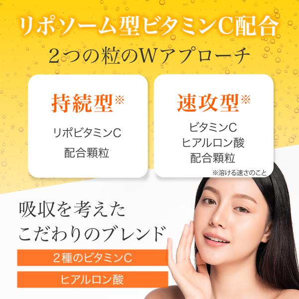 ◇黄色の持続型※リポビタミンC配合顆粒と、白色の速攻型※ビタミンC・ヒアルロン酸配合顆粒をぎゅっと詰め込みました。