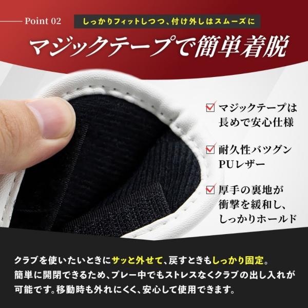 素材には防水性のあるPU革を採用。雨や朝露が付いてもサッと拭くだけでお手入れ簡単です。内側はクラブを傷つけにくい仕様で、日常使いから練習場まで幅広く活躍します。