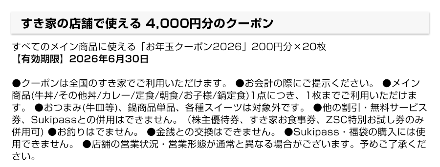 すき家の福袋「SMILE BOX 2026 特別版」すき家の店舗で使える4,000円分のクーポン付き! 数量限定 常温配送