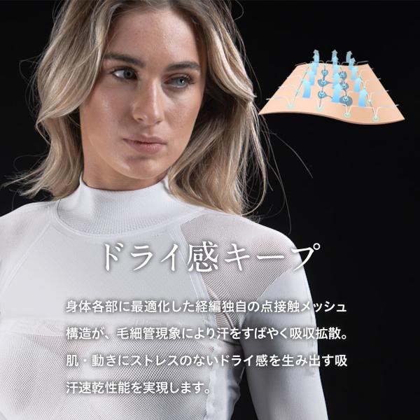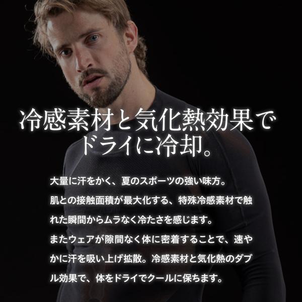 大量に汗をかく、夏のスポーツの強い味方。肌との接触面積が最大化する、特殊冷感素材で触れた瞬間からムラなく冷たさを感じます。またウェアが隙間なく体に密着することで、速やかに汗を吸い上げ拡散。冷感素材と気化熱のダブル効果で体をドライでクールに保ちます。体の部位に最適化された編立パターンで、ストレスフリーなフィット感、そしてUVケア性能。汗抜けにすぐれ、不快な汗を残しません。