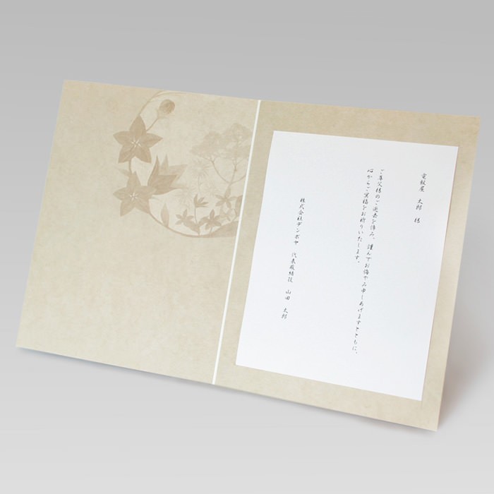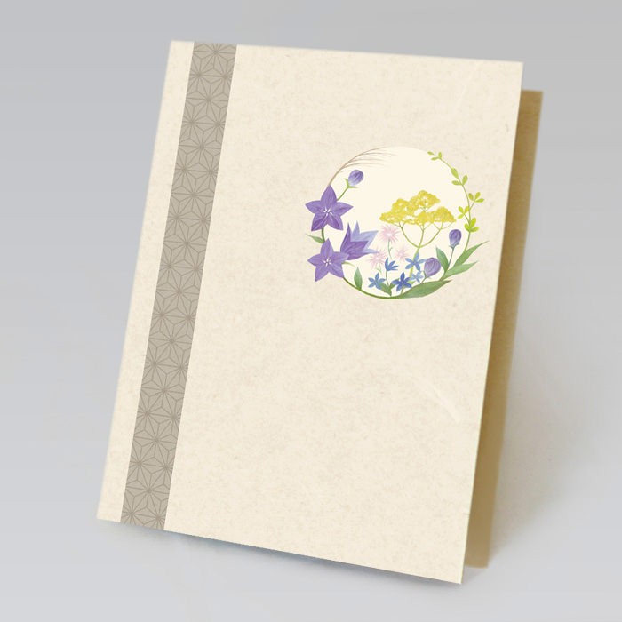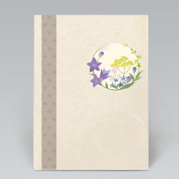 草花のリースが故人を偲ぶ想いを優しく包み込んでくれます。和紙のような温かく柔らかな手触りの台紙で、穏やかで落ち着いた印象を与えます。