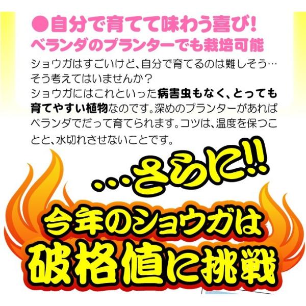 花と緑 国華園 ★★★★★ 4.0(30,342件) 種ショウガ 大ショウガ (黄肉) 1kg / 生姜 しょうが 家庭菜園 自家菜園 安い 激安 万能 香りが良い 大きい 万能 黄金 ★★★★★ 4.17(12件) ●商品情報:香りが芳醇で味わい抜群。しっかりした果肉でどんな料理にも使いやすい万能ショウガ。よく肥大し、太く大きく見栄えします。●お届け状態:種ショウガ●草丈:40〜60cm●収穫期:9〜11月●日照:半日陰●栽培適地:畑 花と緑 国華園 人気ランキング もっと見る 花と緑 国華園 商品一覧 もっと見る