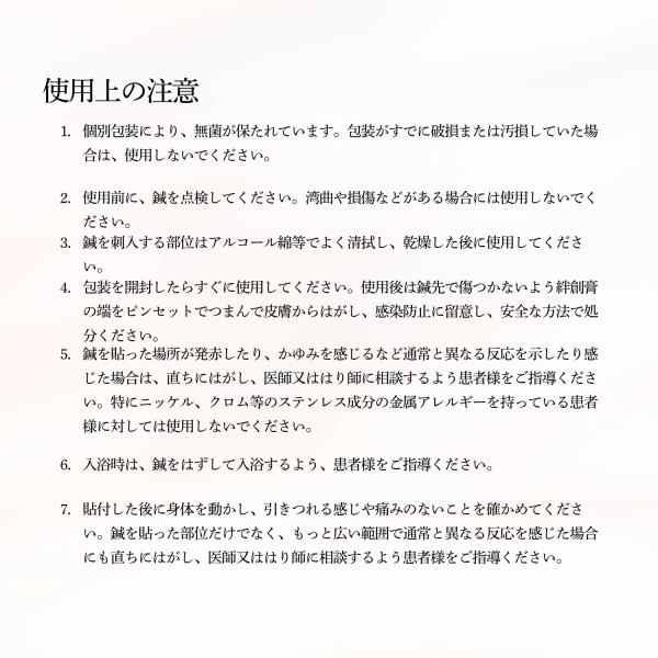 テープで鍼を挟み込む二重構造となっているため、鍼に安定感があり、施術点にピンポイントに刺しやすいです。また鍼の抜け落ち等のリスクも大幅に低減出来るので安心安全です。