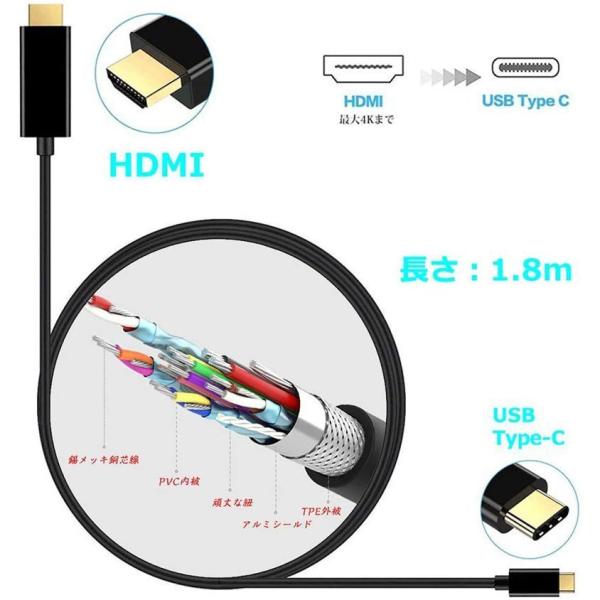 【設定不要&使用簡単】本TypeCtoHDMIケーブルはの長さは180cm、ご使用のUSBC機器パソコン、テレビ、スマホから外部のHDMIデバイス(モニター、TV、プロジェクト等)に簡単に接続し、4K*2K(3840*2160)映像・高速音声データ転送を同時にサポートするためのUSBCHDMIケーブルです。余分の配線なく、ご使用の設備に挿すだけで使用可能です。面倒な設定やドライバ、アダプター、電源出力は一切ありません。