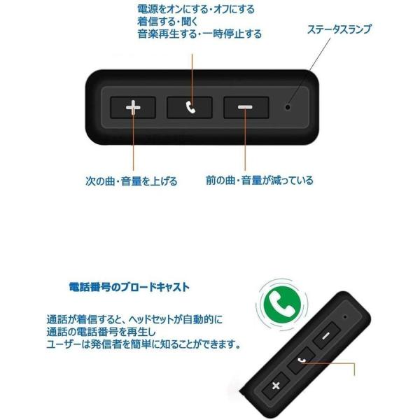 パワーオン/オフ、再生/一時停止、前の曲/次の曲、音量+/音量-、電話を切る/リプレー