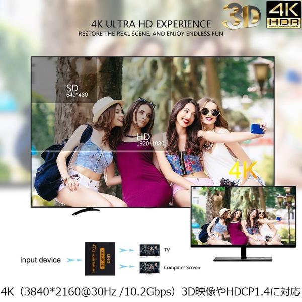 【4K*2Kまでの解像度に対応】4K(3840*2160@30Hz/10.2Gbps)、3D映像やHDCP1.4に対応しており、美しく高精細な4K映像を劣化なく出力できます。展示会や会議など、多くのモニターに同時出力させる場合に適します。(※PS4proに非対応)