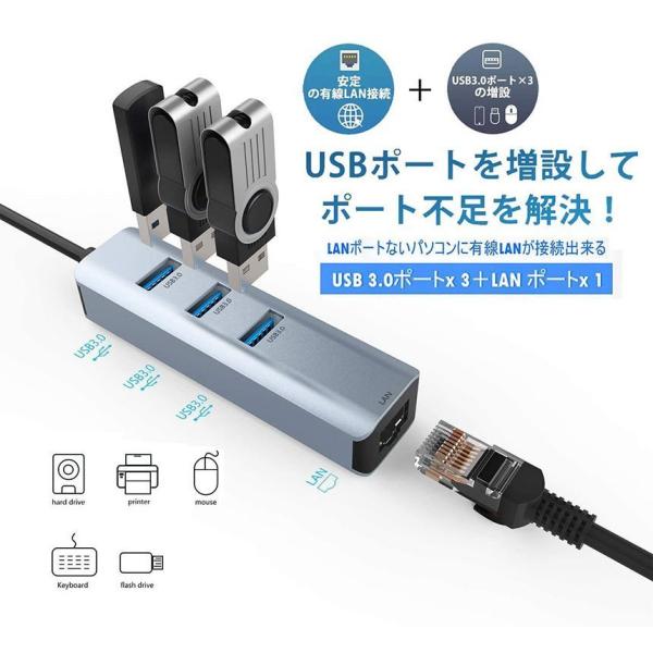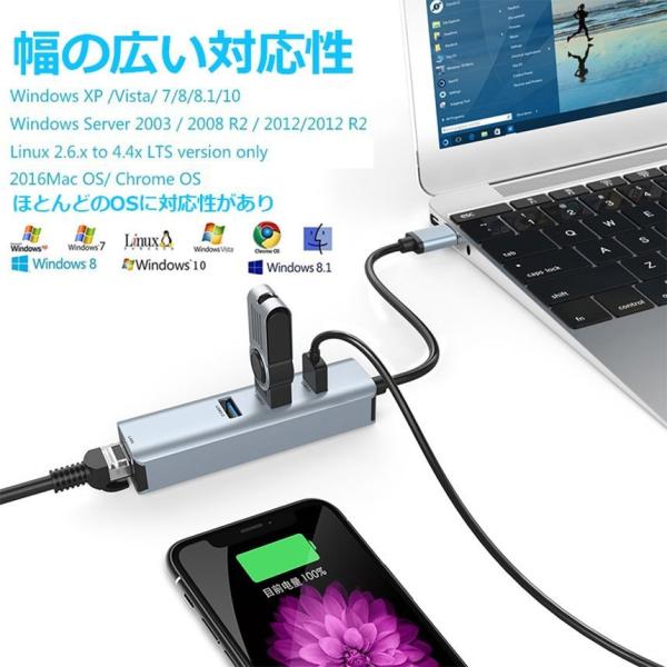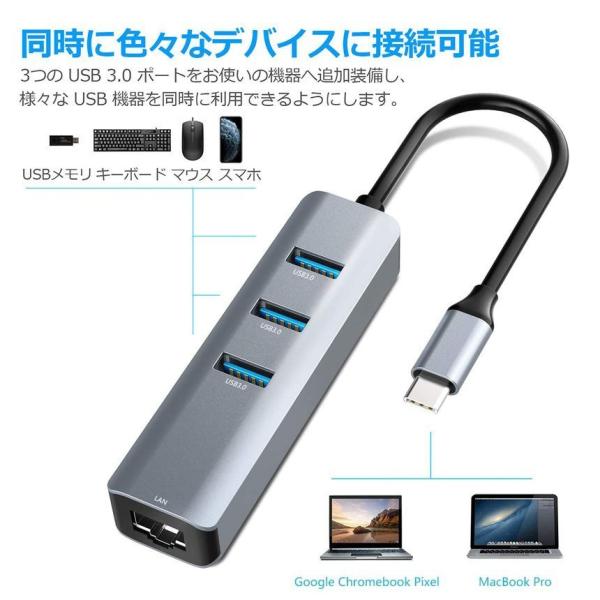 【5Gbpsデータ転送】このタイプCイーサネットアダプタは、フラッシュドライブ、ハードドライブ、キーボード、マウス、プリンタなどの複数のUSB周辺機器を接続するための3つのUSB3.0ポートを備えております。