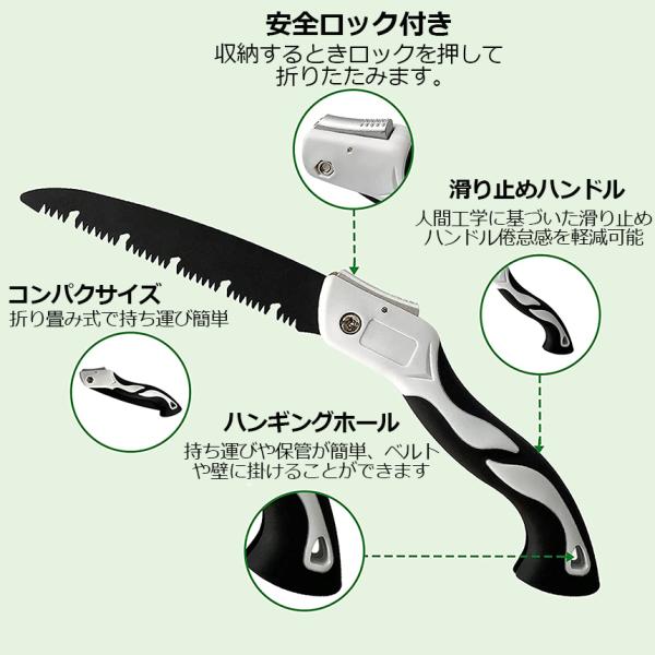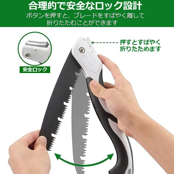 【安全ロック付き】安全ロックを押すとの鋸歯がすばやくに収納可能。収納後刃はハンドルに完全にフィットするため、閉じたときに歯が露出することはありません。持ち運び中の安全性が非常に高くなります。