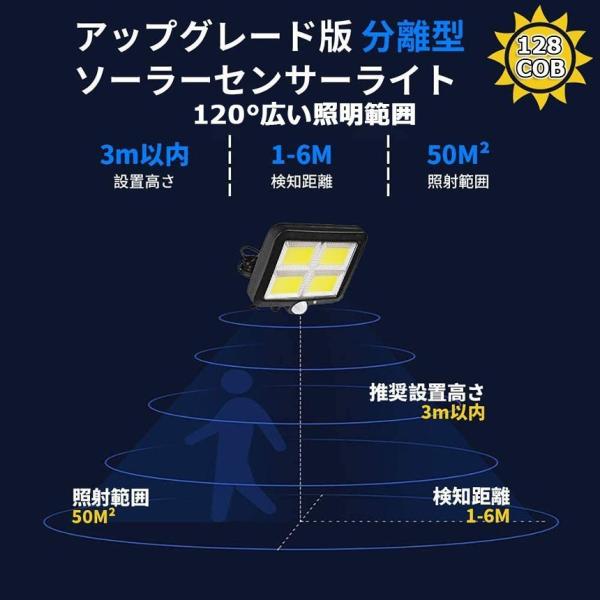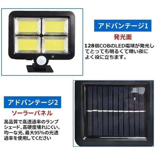 センサーライト 2台セット 128COB 屋外 ソーラーライト COBチップ採用 3モード 120° 照明範囲 ソーラーライトモーションディテ