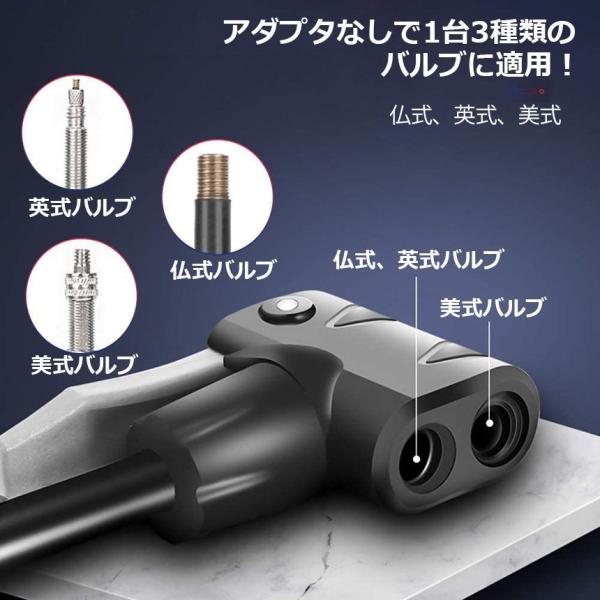 【多機能空気入れ】米式/仏式/英式バルブ対応ので、いつまでも簡単に切り替え可能、一台三役使えて便利です。様々なシーンで大活躍です。バルブコネクタを取付ける必要がないので、同製品より操作が易いです。道で広く使用されています