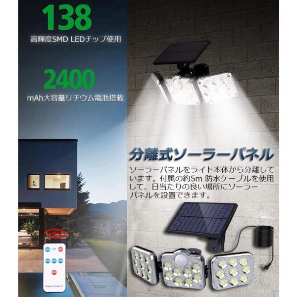 ソーラーライト 2台セット 138LED 3灯式 リモコン付き 5mコード付き センサーライト 防犯ライト ガーデンライト アウトドア ソーラー
