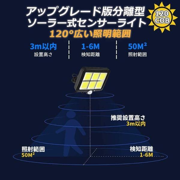 【120COBチップ採用】より明るいCOBのLEDソーラーライトにより、検出と照明角度は120°で、より広い照明エリアを覆うし、広い範囲で最大限に明るさを提供します。これにより、夜間でも通行人に明るく安全な環境が作り出されます。