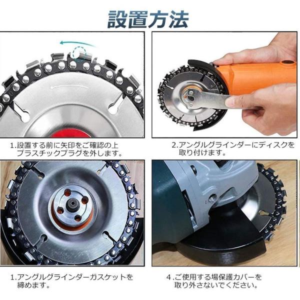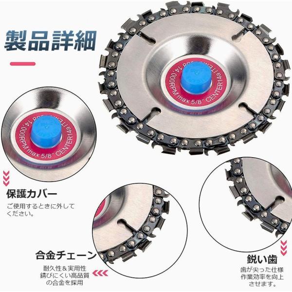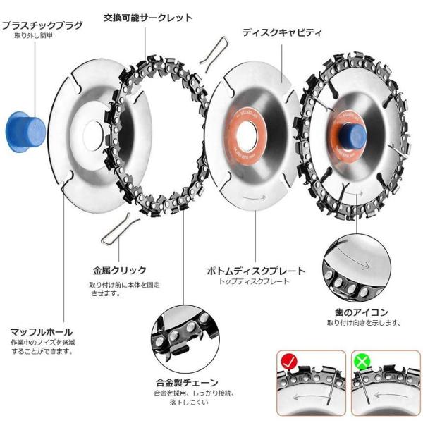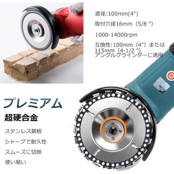【優れたデザイン】木彫りディスクの鋸刃はステンレス鋼製で、22歯の硬質合金鋼のチェーンリングは、耐摩耗性、耐傷性に優れ、簡単に木を切ることができます。グラインダー研磨ディスクはタングステン鋼でできており、とげのある鋸歯状デザインで材料を素早く取り除くことができます。(ご注意:異なるロットの製品の製造により、木彫りディスクの真ん中の色は異なる場合(オレンジ色又はパープル色)がありますのでご了承くださいませ。)