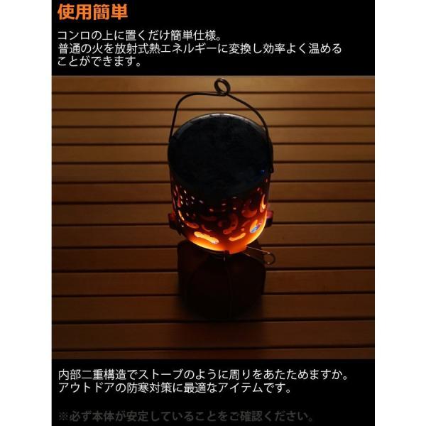 【二重熱放射構造】内部は二重構造で熱伝達を加速することができます。ストーブのように周りを暖かくします。 キャンプ・登山・釣り・ツーリングなど、アウトドアの防寒対策に最適なアイテムです。遠赤外線ヒーターとして使えるアタッチメント。