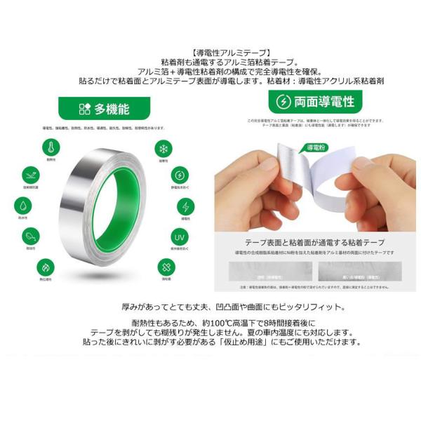 粘着剤も通電するアルミ箔粘着テープ。アルミ箔+導電性粘着剤の構成で完全導電性を確保。貼るだけで粘着面とアルミテープ表面が導電します。粘着材:導電性アクリル系粘着剤。