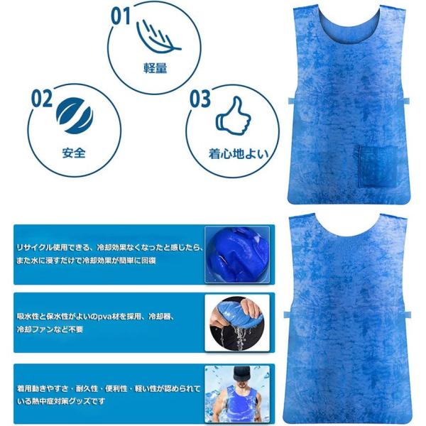 ベスト本体を約3-5分間水に浸すだけ、3~6時間にわたって心地よい冷却効果が得られます、生地に水分を完全に吸収させます。水滴を落とさずに強く絞れば、着てすぐに冷やすことができます。数時間の暑さからの瞬間的な冷却の救済と快適さをお楽しみください。