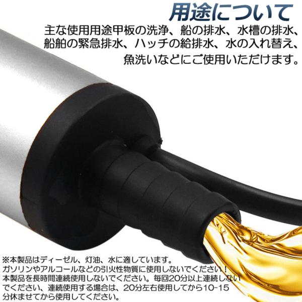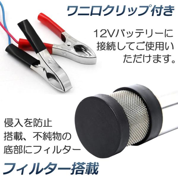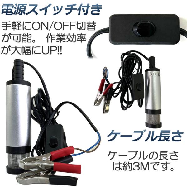 【商品仕様】:ON/OFFスイッチ付き 高さ:約16cm ポンプ直径:約38mm 吐出口径:約16mm ケーブル全長:約3m 吐出量:約12L/min 揚程:2m 電圧:DC-12V 電流:1.5A 接続方式:クランプ(ワニ口クリップ) 材質:ステンレス 適用範囲:ディーゼル、水、灯油、オイル等