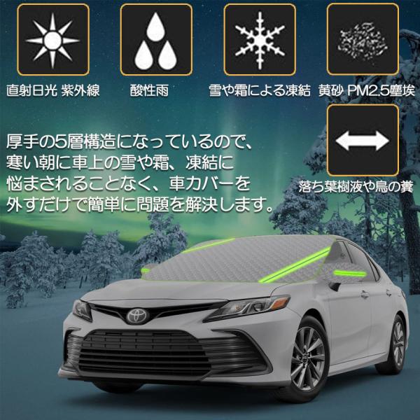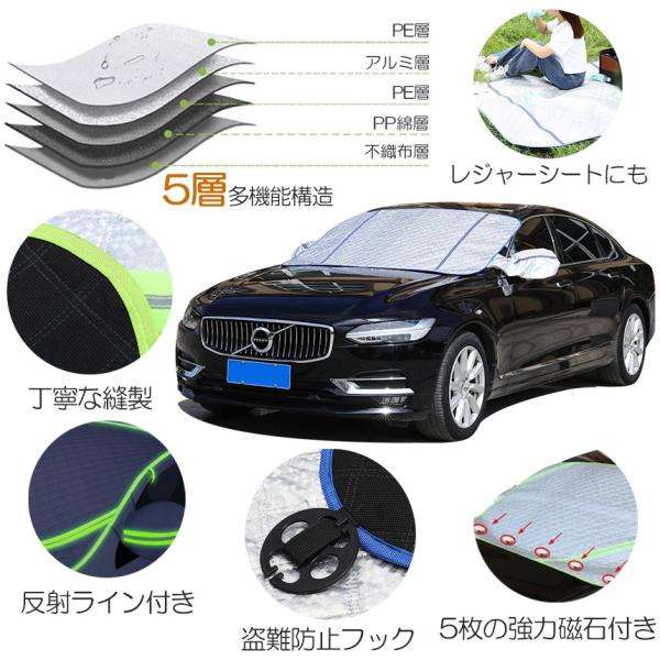 【凍結防止&積雪対策】従来の薄手モデルと違い、5層構造の厚手の素材で、寒い朝に車内の雪や霜、氷を取り除く必要がありません。 取り外し簡単!2カラー:グリーン・ブルー。2サイズ:M(148x103cm)・L(157x103cm)。