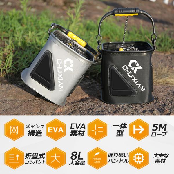 釣り バケツ バッカン 水汲み みずくみバケツ 釣り 折りたたみ バケツ 8L チャック付き 魚が逃げない ロープ 5m EVA 海釣り 生かし