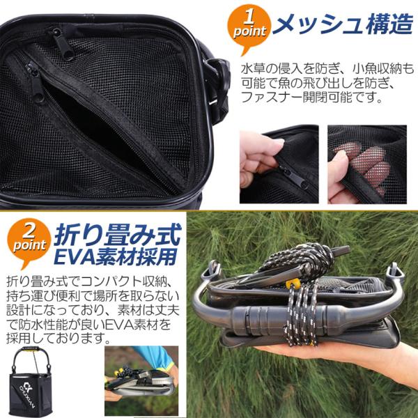【便利なメッシュカバー】ファスナー付きメッシュ蓋つきで魚が逃げることも無く、簡単に水替えでき、そのまま海中へ沈めておくことも可能です。また、5メートルのロープ付き水辺まで距離がある場所でも簡単に水汲みができます。
