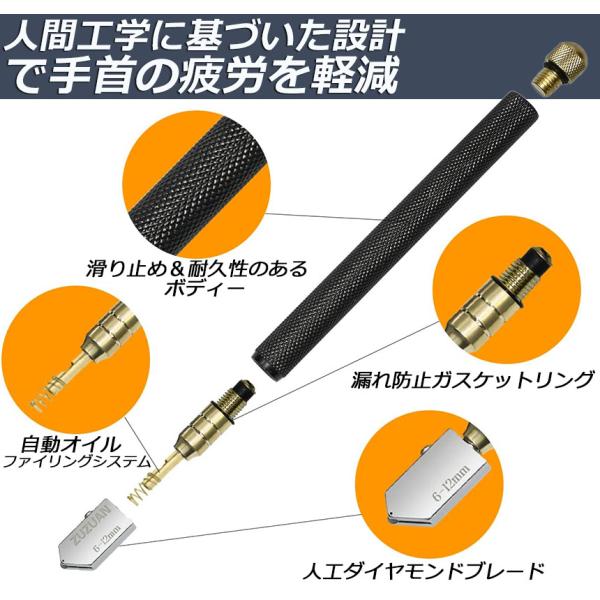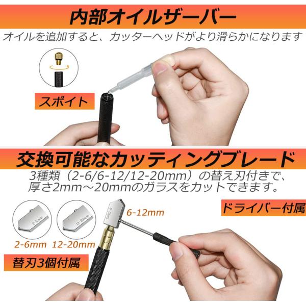 【素材】ガラスをカットするためにデザインした、人間工学を基づいて作り上げたアルミ合金製ハンドルです。もっと気軽に使えます。刃はタングステン鋼を採用し、デジタルコントロール精密機械によって作られました。