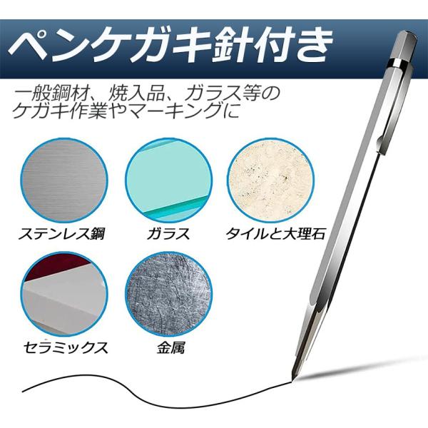【ペンシルケガキ針】用途:一般鋼材、焼入品、ガラス等のケガキ作業やマーキングに;ガラス、セラミック、タイル、石、金属の表面にテキストやパターンを刻印できます。(注意:ケガキ中は、45°以上倒さないようにし、できるだけ垂直に立てて使用してください。)