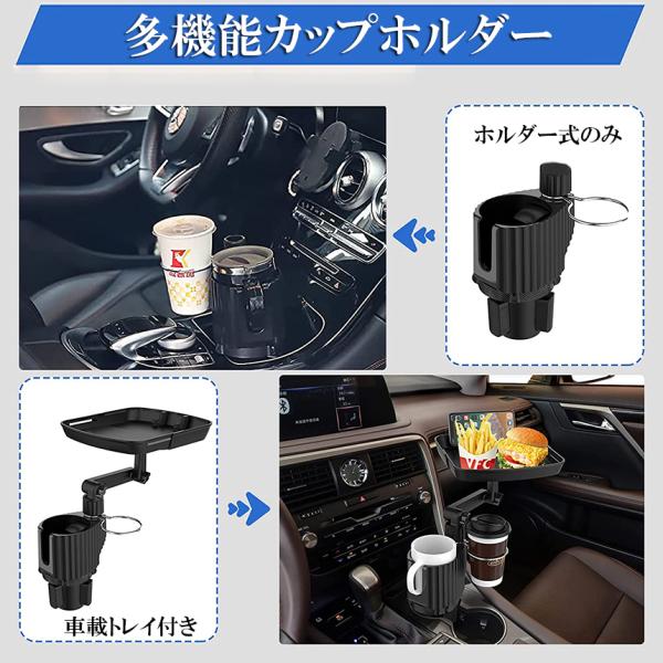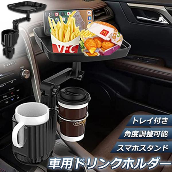 ドリンクホルダー トレイ車用 車載トレイ 車用トレイ スマホスタンド カーテーブル 2in1 差し込み式 多機能 360°回転 スマホ 小物入れ