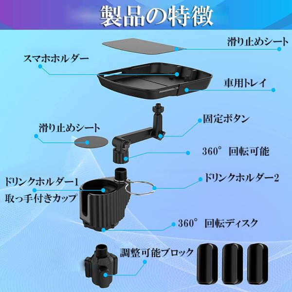 ●車内での携帯電話の置き場所に困った経験はございませんか?簡単にテーブルが設置できるドリンク穴取り付け式の車内用ミニテーブルです。 ドリンク穴1個でテーブルプラスドリンク置き場2個増設できます。