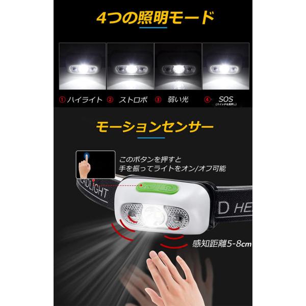 4種の点灯モードを提供:ホワイトビームの高・中・低;緊急用のSOS点滅。センサー機能も搭載され、LEDヘッドライトが手の動き(5-8cm以内)を感知して自動的に点灯/消灯します。