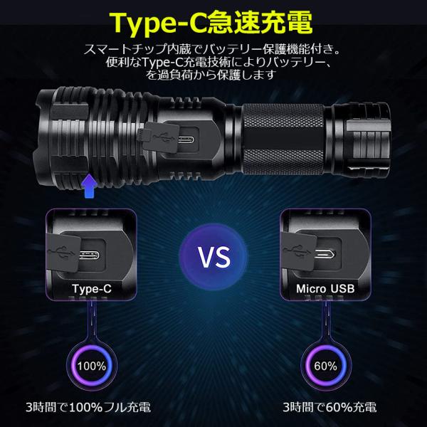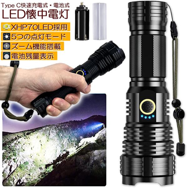 懐中電灯 XHP70 強力 防水 USB充電式 電池式 LCD残量表示 ズーム機能 5モード調光 TYPE-C入力 ledライト フラッシュライ