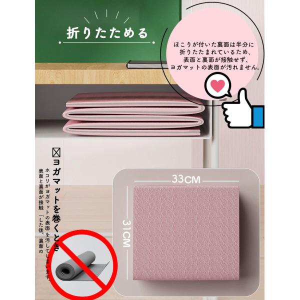 【最先端の環境にやさしい素材み】TPE素材を使用しています。無臭、非毒性、優れた弾力性、驚きの軽さ、動きやすい優れた柔らかさ、滑り止め機能といった特徴があります。【折りたたみ設計】素早くコンパクトに収納できることに特化して設計された折りたたみマットです。従来のヨガマットは丸めてバッグに入れ、ストラップで留める必要がありました。それでは時間が掛かります!当社は、単に折りたたむだけの最もかんたんな設計を実現しました。どこに行くにも、楽に持ち運べるマットです。